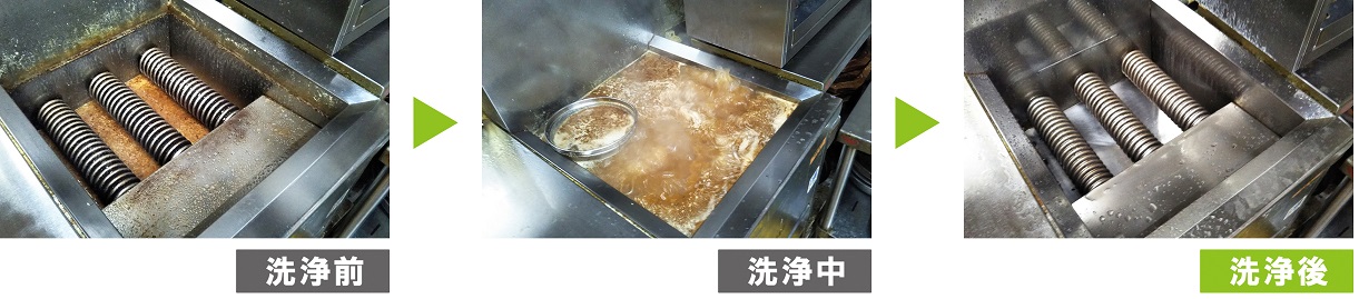 以前はキツイ洗剤でゴシゴシと時間と手間をかけて洗浄されていましたが、今回より時間も手間もかけずフライヤーを洗浄することができると大喜びされていました。