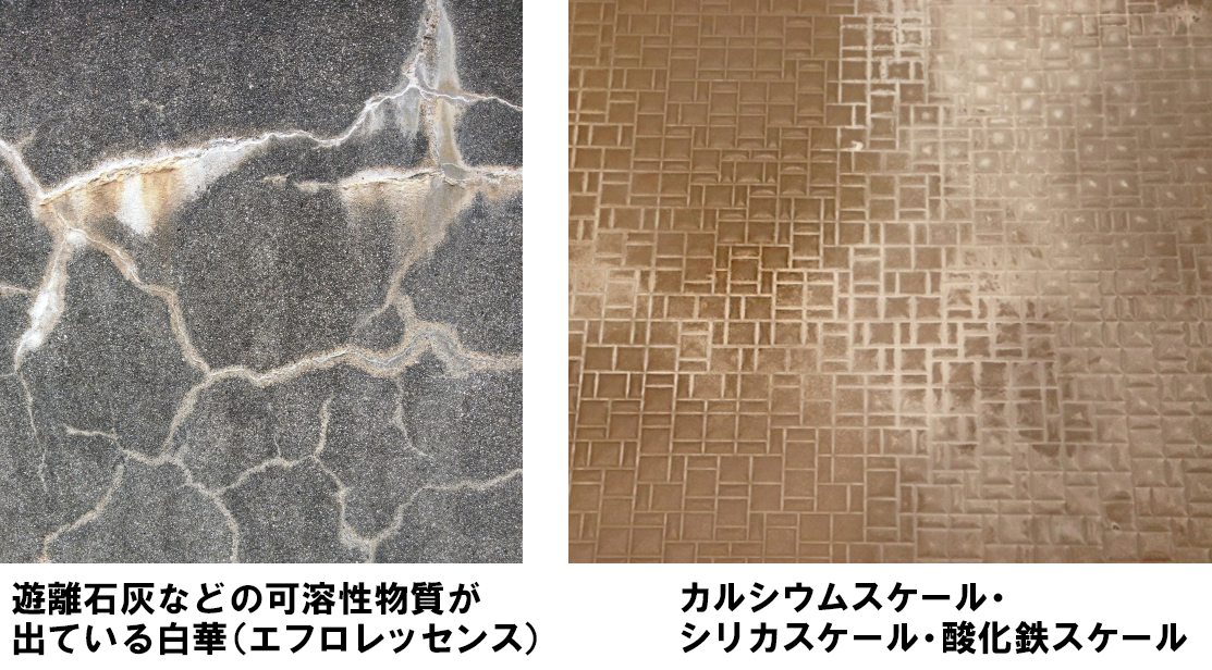 エフロレッセンス(エフロ・白華)、水垢それぞれ違う物質です。