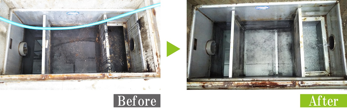 配管洗浄と併せてグリストラップ(油水分離槽)もキレイに洗浄。日々食器洗浄や備品洗浄でオススメの洗浄剤を使用すると配管やグリストラップ(油水分離槽)のメンテナンス回数を削減することもできます。油が酷いようであればオススメの油吸着マットを浮かべれば完璧です。