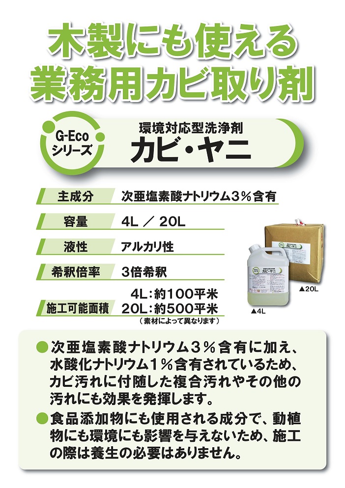 G-Ecoシリーズ環境対応型洗浄剤カビ・ヤニなら、1本で木製、コンクリート、クロス(壁紙)など様々な素材で使用が可能です!